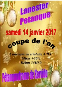 Concours d’hiver 2016/2017 La pétanque LANESTERIENNE Organise en novembre, décembre, Janvier des concours ouvert à tous . Concours en doublette, Mises + 30% Samedi 5, 12, 19, 26 Novembre 2016 Samedi 3 et 10 décembre 2016 Samedi 28 Janvier 2016 SAMEDI 17 Décembre 2016 Coupe de Noël en triplette, mises +50% et de …